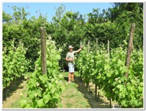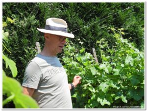 Wat vreemde vogel. Dit is onze Jos die serieus zijn druiven planten met vrucht bekijkt of alles nog goed gaat. Volgens hem gaat het tot nu toe volgens plan.