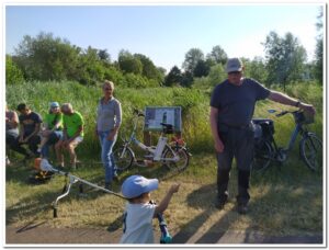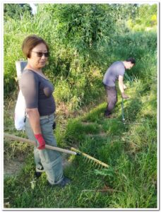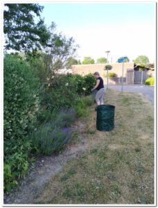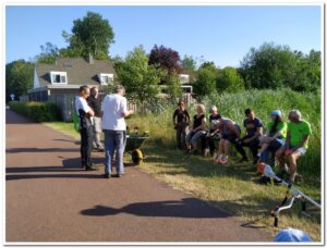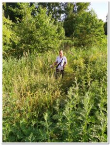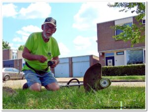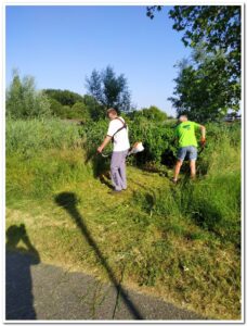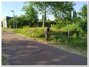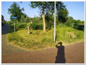 Jos in de bocht. Ook weer tussen het gras langs het natuurpad en talud om de planten vrij te bosmaaien van gras en andere wilde uitschieters.