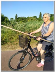 Daar komt Ine ook aan met de hooihark. Nu zijn we compleet.