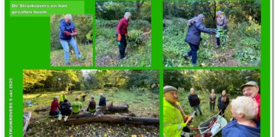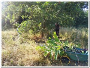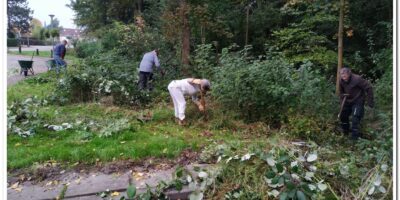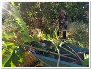 Aan het einde van het krachtbossie staat een boom, waar omheen veel berenklauwen gezien is. Hier is Carol en Johan bezig om deze planten uit te graven. Er ligt al veel op de kruiwagen.