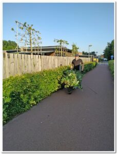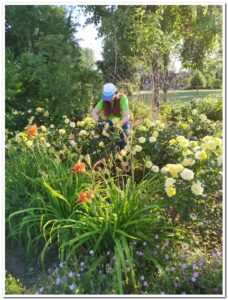 Druk bezig met rozen knoppen knippen die uitgebloeid zijn in de Y/H border.
