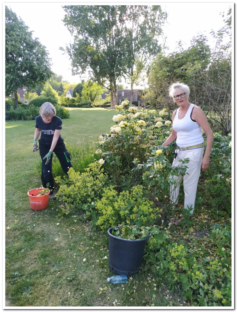 In de drie onderstaande foto’s is te zien dat Yvonne, Marlies en Trees bezig zijn met het afknippen van de uitgeboeide rozenknoppen, zodat een betere verdeling van de sappen ontstaat en weer meer rozenknoppen ontstaan.