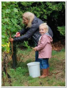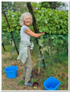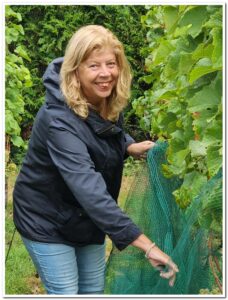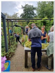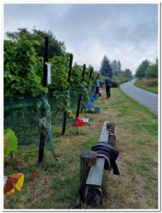 We kunnen beginnen. Alle netten kunnen verwijderd en de fleece zakjes die om sommige soorten zitten kunnen eraf. De aller zoetste druiven (Solaris) hebben fleece zakjes omdat ze anders worden opgegeten door wespen; de rode druiven worden, zelfs dóór de netten heen, door vogels gegeten dus die zijn ook extra beschermd met fleece zakjes.