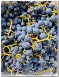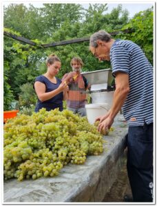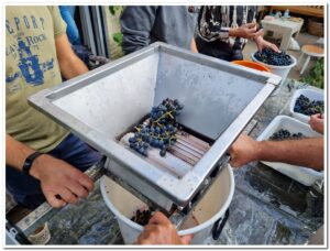 De beschadigde druiven worden verwijderd, de trossen gaan door de kneuzer en worden opgevangen in een grote RVS tank. Hierbij gaan wat enzymen (pectinase) om het vruchtvlees van de schil los te maken. En dit moet even inwerken.