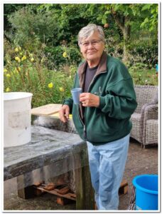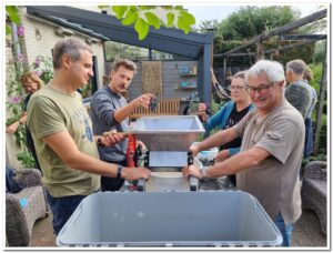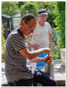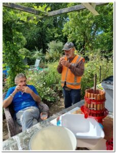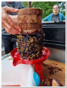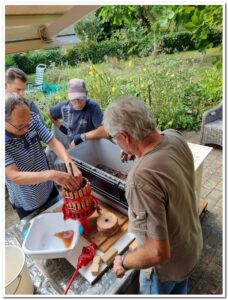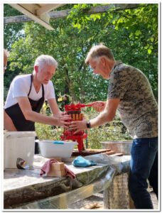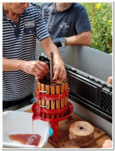 Hier zijn ook de wespen dol op merken we! Het sap wordt opgevangen in een teiltje en gaat daarna het fermentatievat in samen met de gist. Die kan nu beginnen aan de suikers te knagen en daar alcohol van te maken, hips.
