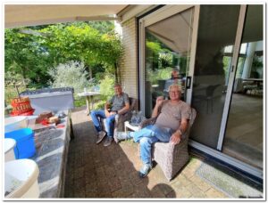 Precies met koffietijd komt er een mini-buitje over en ineens wordt het gezellig druk onder het afdakje. Maar heel snel gaat zelfs alweer de zon schijnen.