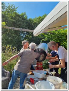 En al snel vormt zich een lekkere berg op de achtertafel in de tuin. Jos dochter Eva komt ook meehelpen.