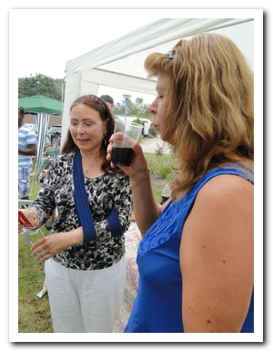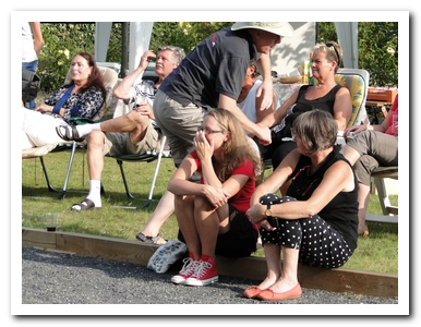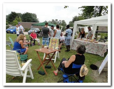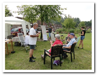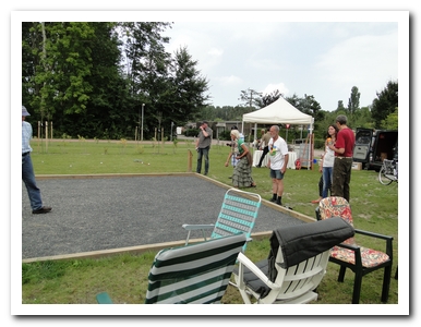 Het begon al met mooi weer tijdens het opbouwen van de twee partytenten één voor een schaduwrijke plek en de andere voor de koelkast met drankjes, de hapjestafel en het bord voor de puntenscores van Dick Groenenwegen. Wij waren nauwelijks klaar en daar kwamen al de eerste deelnemers. Ze konden gelijk al een drankje nuttigen. Na een half uurtje waren alle 30 deelnemers aanwezig, waarvan de oudsten niet meededen maar ons wel aanmoedigden. De Franse achtergrondmuziek, verzorgd door Bart Buijs, maakte de sfeer compleet.