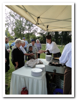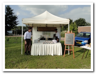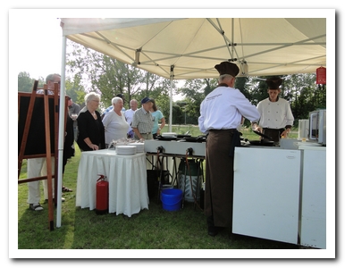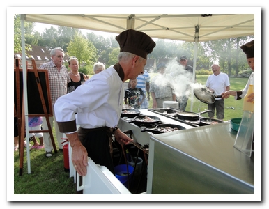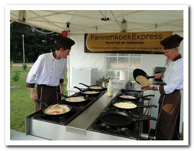 Na de prijsuitreiking werden we op een unieke manier verrast met heerlijke pannenkoeken. Deze mobiele pannenkoekexpress werd door hun opgebouwd met wel acht gaspitten. Hierop bakten zij achter elkaar diverse soorten pannenkoeken. Het liep storm want het smaakte prima. Tijdens het eten liep het aantal op tot 38 aanwezigen. Iedereen vond het een goed en leuk idee. Een grote opkomst deze dag en zeer geslaagd.