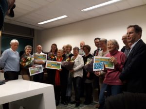 Met woorden van waardering van de burgemeester en wethouder Peters ontvangen Regien, Ine, Leida en Bram, onze vertegenwoordigers van de EZH, bij de uitreiking van de ‘Meer Dan Handen Vrijwilligersprijs’, een cheque van € 500,- . Complimenten alom voor alle EZH-deelnemers dat wij al ruim 6 jaar vrijwillig onze buurt onderhouden en elkaar helpen waar nodig en mogelijk.