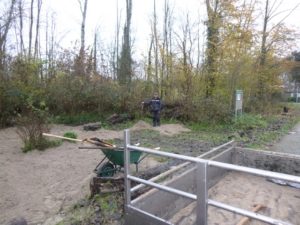 Anton koppelt een graafmachine aan de Lapkar. Wat een gelukkig koppel! Zo zijn Lap, Anton, Henk en Johan bezig met het verplaatsen van snippers van het Aquamarijn naar de Y&H border. Henk verspreidt de snippers in de Y&H border.