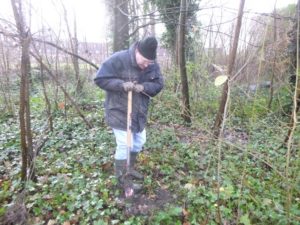 In opdracht van de gemeente levert de Tomin (dank aan Jaap, Theo en Bea) inboet voor het vogelbos (Lap en ik kuilen het plantgoed in) en een moeraseik voor het windbos. De Tominners helpen Tim en mij bij het planten van de eik. Waarvoor hartelijke dank.