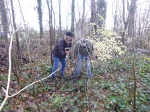 De vogelbossers hebben een paar regen- en hagelbuien te verwerken. Maar dat deert niet; er worden 60 eiken, beuken, elzen en nog wat geplant. Lap;” Vanochtend gelukkig bij “droog” weer met 7 vogelbossers, 5 soorten bomen geplant verspreid door het bos (totaal 60 stuks). Daarna in Marrie haar achtertuin een meidoorn boom weggezaagd die vervaarlijk schuin tegen haar ramen helde”.