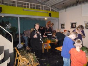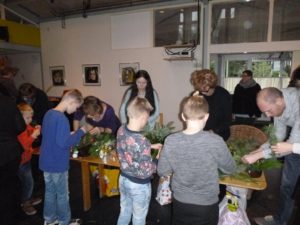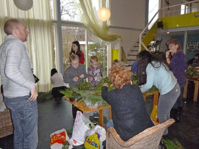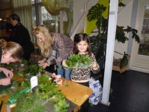 De KerstTrees is druk, warm en gezellig. Buiten is het guur, grote sneeuwvlokken dalen neder rond de KerstTrees stal. Anita loopt af en aan om KerstTrees stukjes, gemaakt door o.a. Elise en Trees, rond te brengen aan mensen die niet kunnen komen. Trees;” Kerststukjes maken voor en door de buurt. Het is een jaarlijks festijn waar groot en klein met veel plezier creatief is. Dit jaar weer nieuwe gezichten erbij en ook een paar jeugdigen die na 5 jaar zelfstandig een groot kerststuk maakten. Apetrots ging ieder na een leuke lekkere creatieve middag, met een kerstkrans of -stuk voor buiten op de tafel of voor in ‘t tuinhuis of voor op de tafel in huis, tevreden en met een kerstgroet naar huis. Velen hebben een kerststuk voor een ander in de wijk gemaakt en die werden weer door diverse buren bezorgd. Wat een mooi wijk gebeuren!!”
