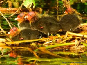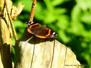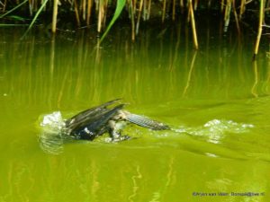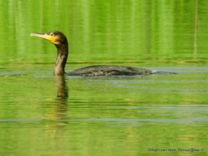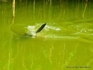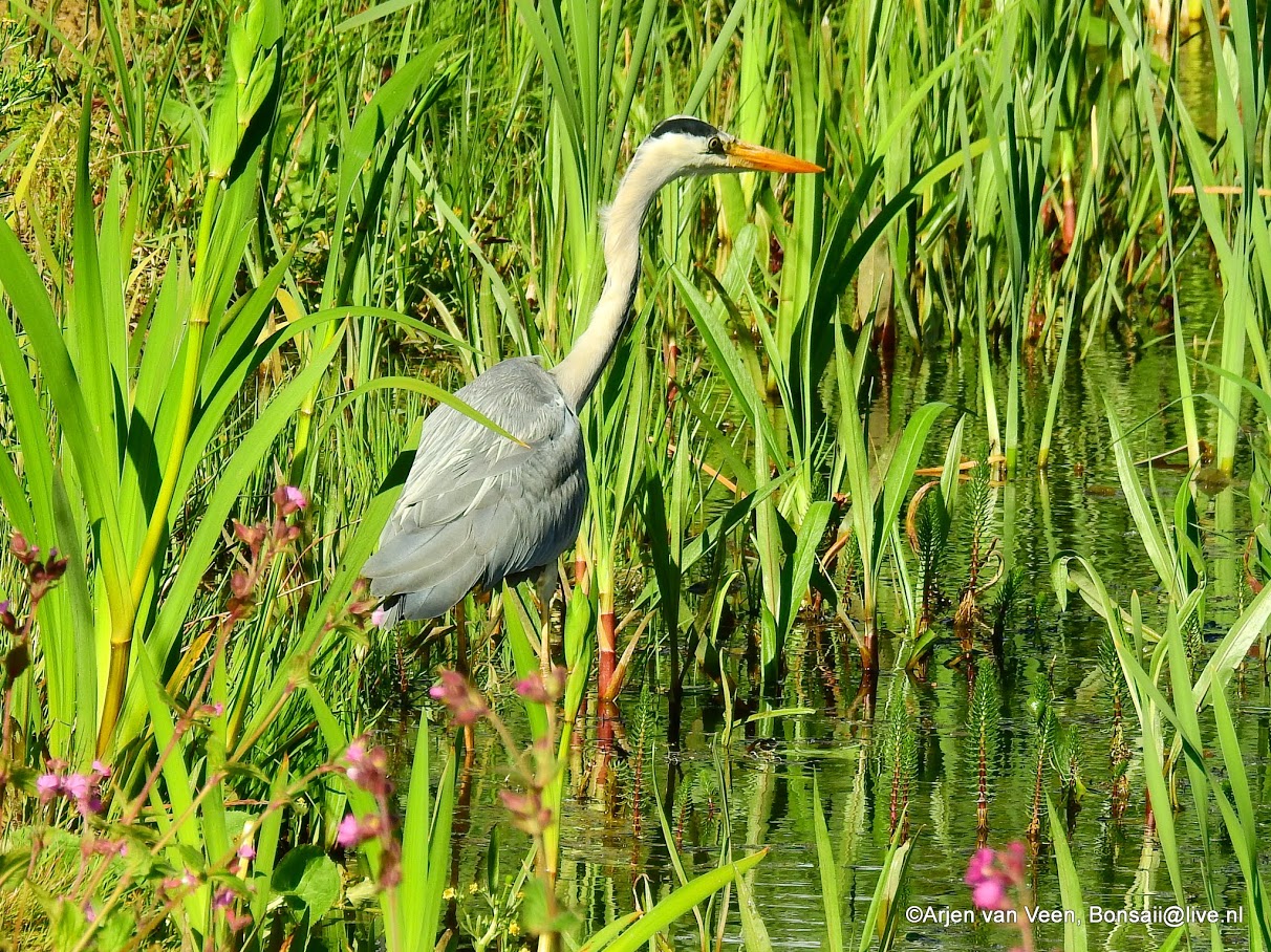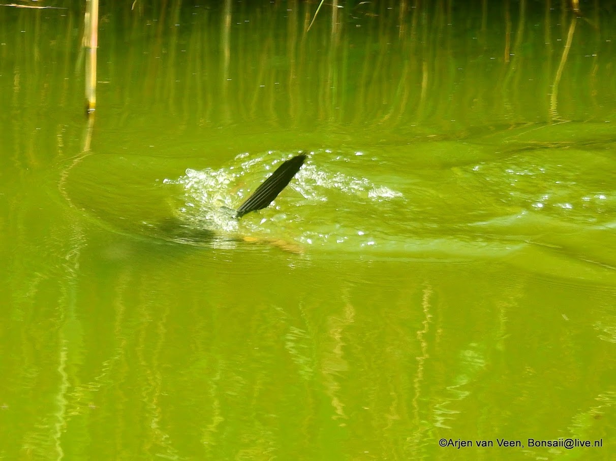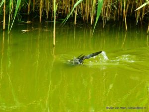 Timmetje en ik zitten op de bb te genieten van een explosie aan juffers en libellen. De aalscholver en de reiger genieten ook. Wij zien hoe die twee systematisch de beek geheel leeg vissen.