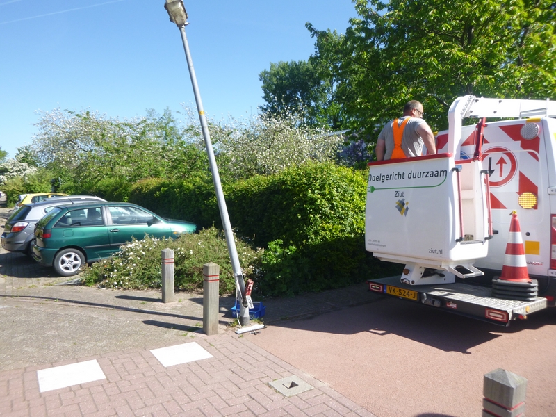 De scheve paal wordt  tijdelijk gerepareerd. Een nieuwe paal is in bestelling.