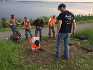 Wat al lang in de pijplijn zat heeft nu een acute aanleiding om te realiseren. 4 prachtige treden in het talud van de dijk aan de gooimeerzijde is het gevolg. De prestatie aan de dijk wordt met grote waardering gevolgd door de leden van de bierproeverij op het bankje van Chris. Dus niet alleen Chris gaat gebruik maken van de nieuwe voorziening. De leden van de proeverij vraagt of het mogelijk is een abri boven de bank te bouwen. Inclusief een schemerlamp. Ook voor genot bij druilerige avonden!