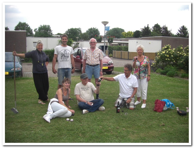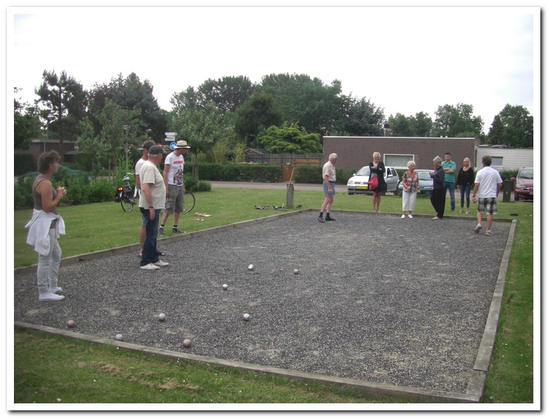 Lap doet een rondje zwerfvuil, leegt de afvalbakken en knipt de wandelpad paaltjes vrij en knipt overhangende takken in het bos. Marlies watert de vaste planten die dat nodig hebben. Joop is weer minutieus bezig met zandverzet. Een grote schare jdb’ers jdb’en nu ook de grasmat kaal. Er zijn ook hang jdb’ers. Tiny en Dick verzorgen een wijntje na afloop. Heel zachtjes klinkt er de marseillaise. Er zijn hier spelers die voor het EK duimen voor les bleus.