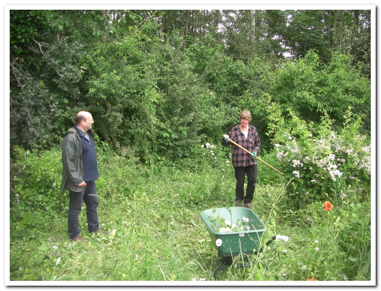en de gereedschapberging. Daar geef ik het stokje over aan Cees van de VLA. Enthousiasme en waardering is ons deel. Wij zien Elly en Thom actief in de steigerborder. Lap knipt de eerste beukenhaag van dit jaar. Samen met Johan wordt het maaisel opgeruimd. En Johan voert gevangen riet af en prepareert zich op het inzaaien van twee paden in kwelbeek noord.
