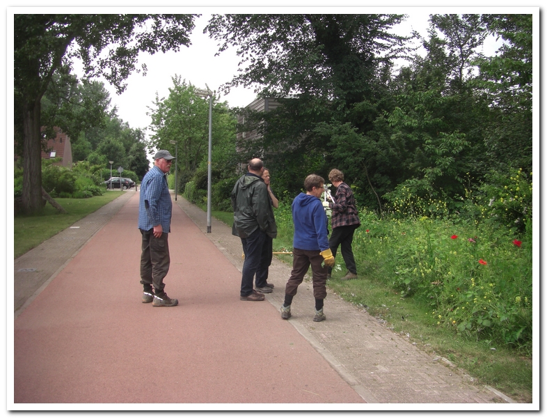 Lap heeft één wandelpaaltje verplaatst in de Velden omdat deze niet zichtbaar genoeg was. Ook borstelt hij een paar uur in de wijk. Tevens knutselt hij dijkjes om de kamperfoelie planten zodat niet al het water direct het talud af spoelt.