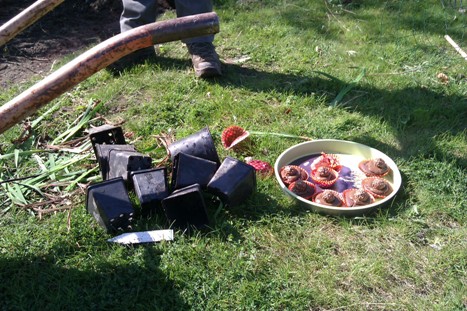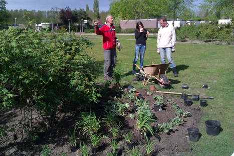 Simon, Bert en ik zijn de hele middag bezig met het aanleggen van een Simons vaste plantenborder. Wij verwijderen die kweek verzamelstruiken en planten honderden plantjes, deels van eigen kweek.