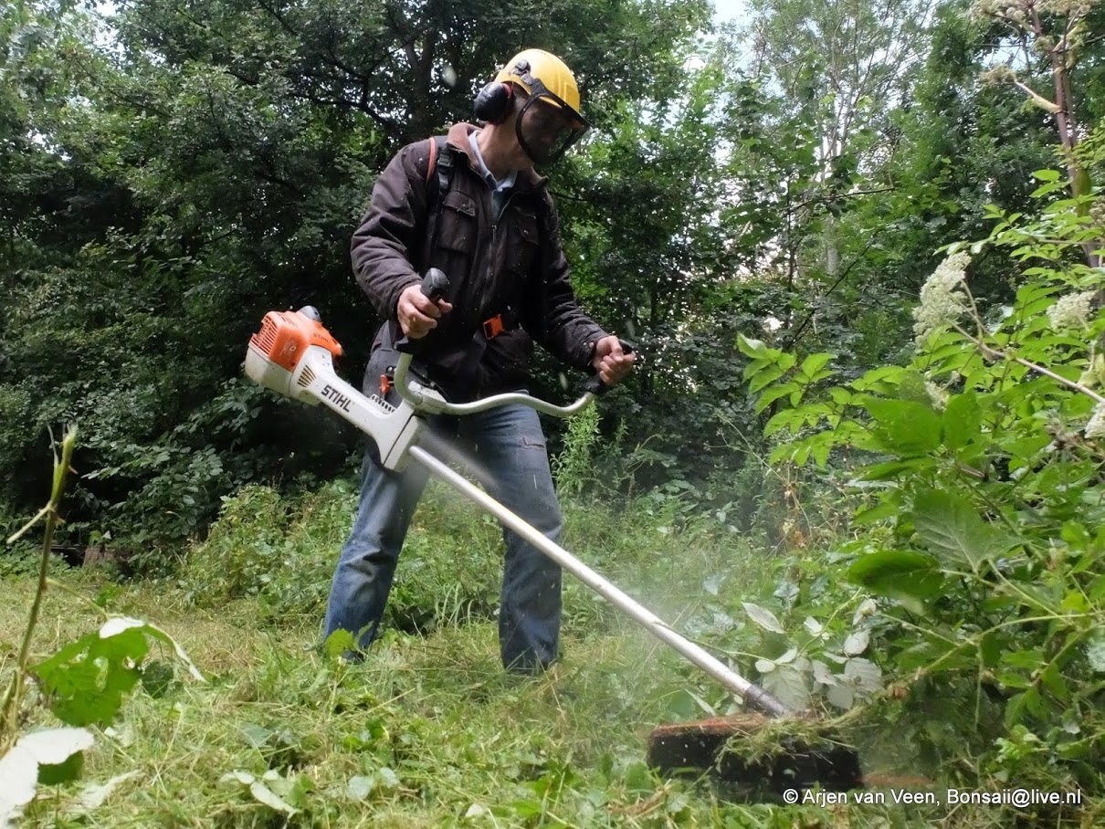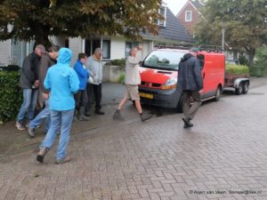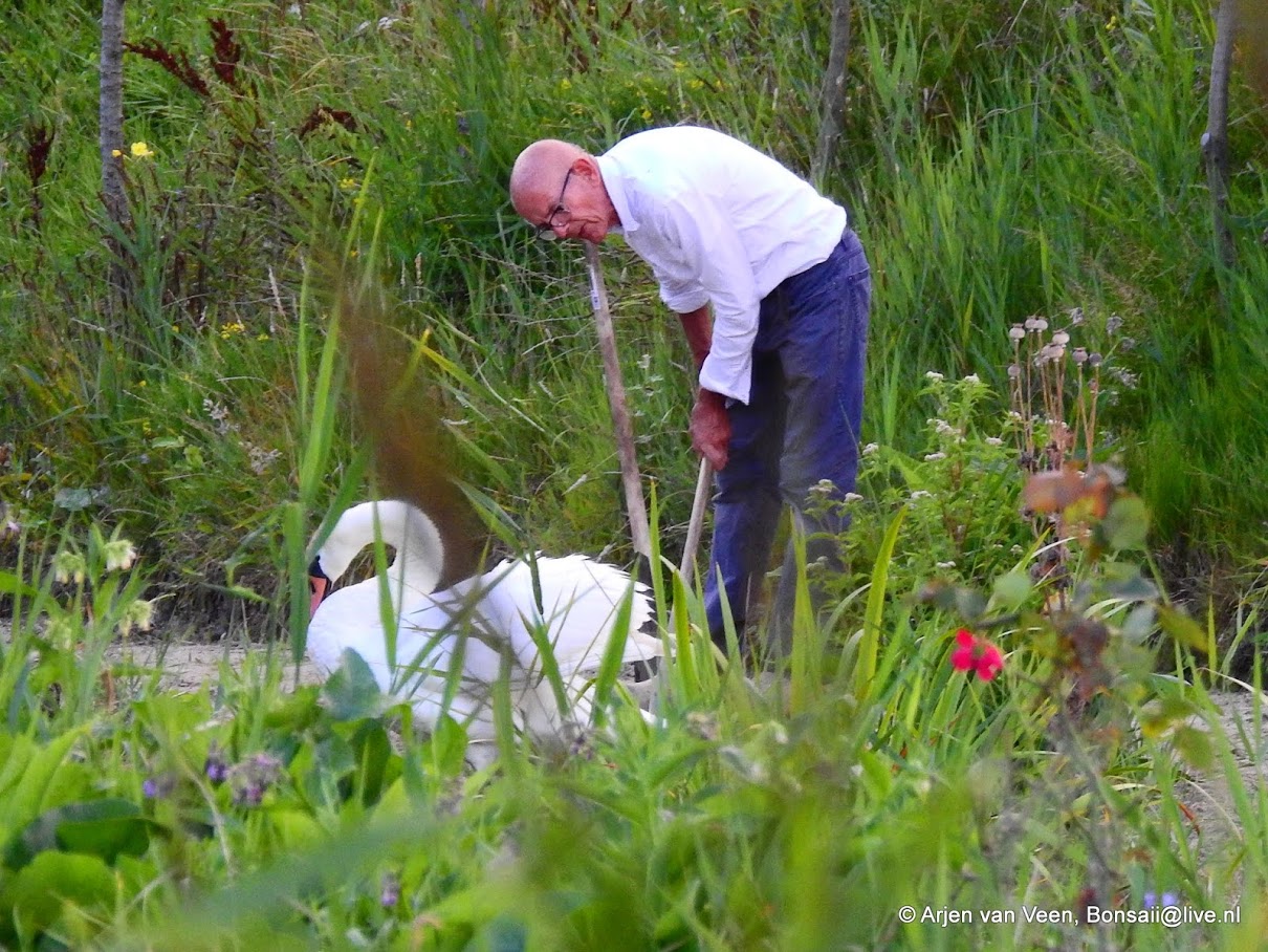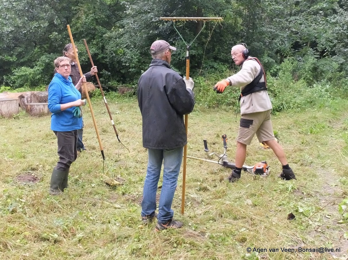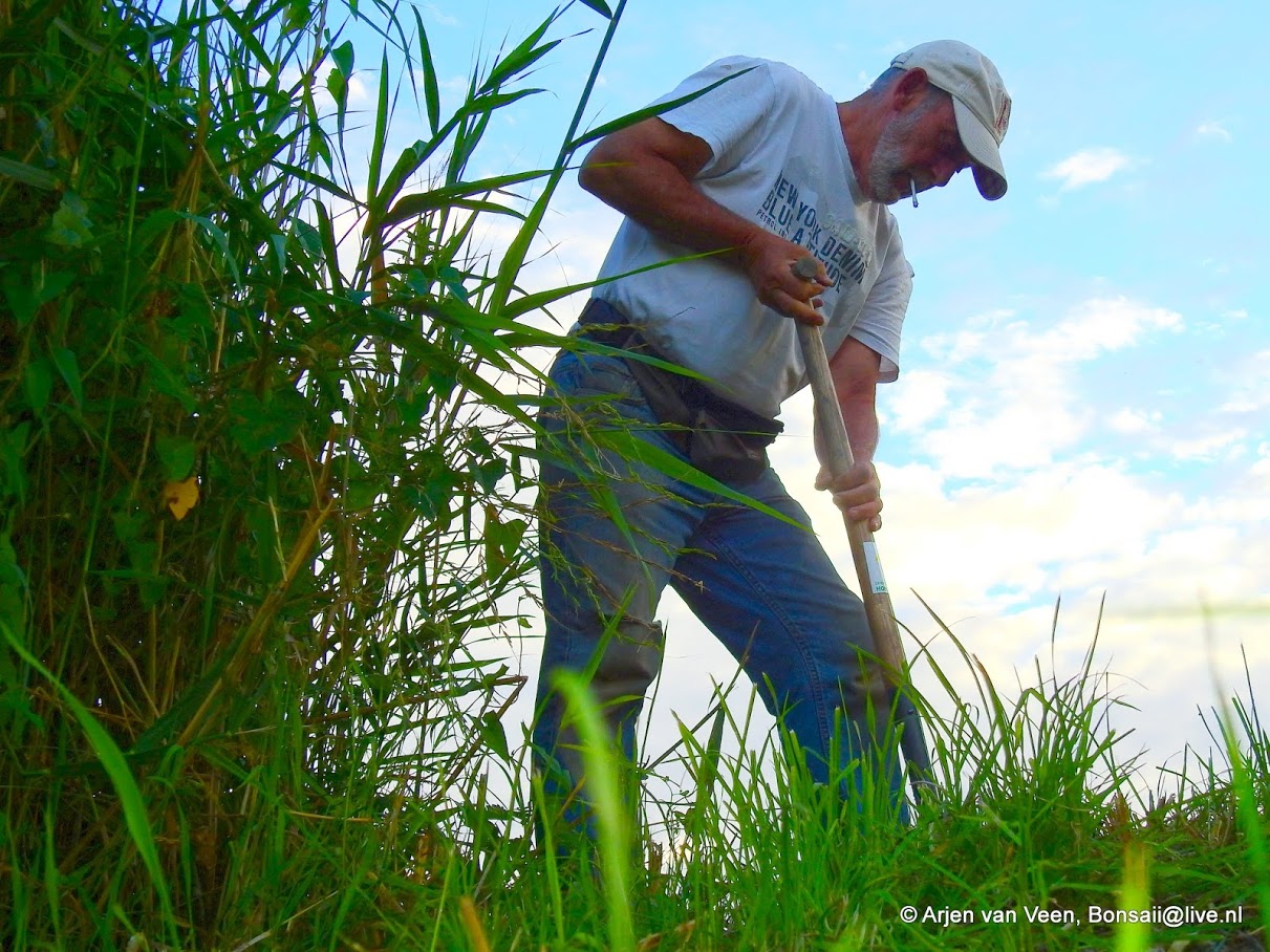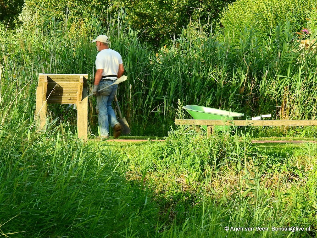 Een echte maaidag. En die was nodig. Het gras groeit als kool en staat voor onze maaibegrippen bijzonder hoog. Waar zijn de schapen als je ze nodig hebt? Het was me het dagje wel. Start om 09.00 uur, weer thuis om 16.30 uur. Om 9 uur starten Ad, Ruben en ik met als opdracht een complete maaironde. Ruben en ik gaan in het bosmaaier harnas op weg naar de zwaarste opgave. Het talud. Daar aangekomen staan daar Thom en Ad hevig gesticulerend te overleggen hoe nu verder. Wat blijkt de KUBOTA gleed naar beneden en wat Ad ook deed de omstrengeling tussen es en KUBOTA werd steeds inniger. Een fraai staaltje van echte liefde op het eerste gezicht. Maar ja, de hele wijk moet worden geknuffeld door de KUBOTA. De liefde moet worden gestoord. Hoe? Om een lang debat kort te houden. Wij kunnen alleen besluiten; de es of de KUBOTA. Marion is er niet om mee te overleggen over de es. Thom pakt de zaag en gaat aan het werk. Maaibaas en Rob zijn inmiddels ook gearriveerd en de maaibaas zorgt hoogst persoonlijk voor de finale bevrijdingactie. Wat moet je zonder maaibaas? En zo zijn wij 1,5 uur verder. Ruben heeft niet stil gezeten. Hij maait het talud van steiger tot Kornbrug. Hierna neemt hij afscheid van ons. De rest van de maaiopdracht ligt aan de voeten van Ad en mij. Ik kan je zeggen na een dag werk branden die voeten maar wij zijn wel trots dat wij alles gemaaid hebben. Onze maaibeurt zit er op. Een nette overdracht aan de volgende maaiploeg.