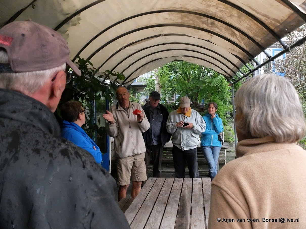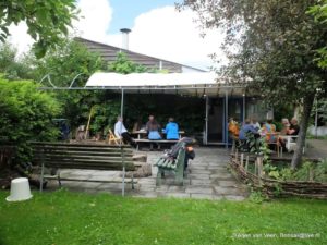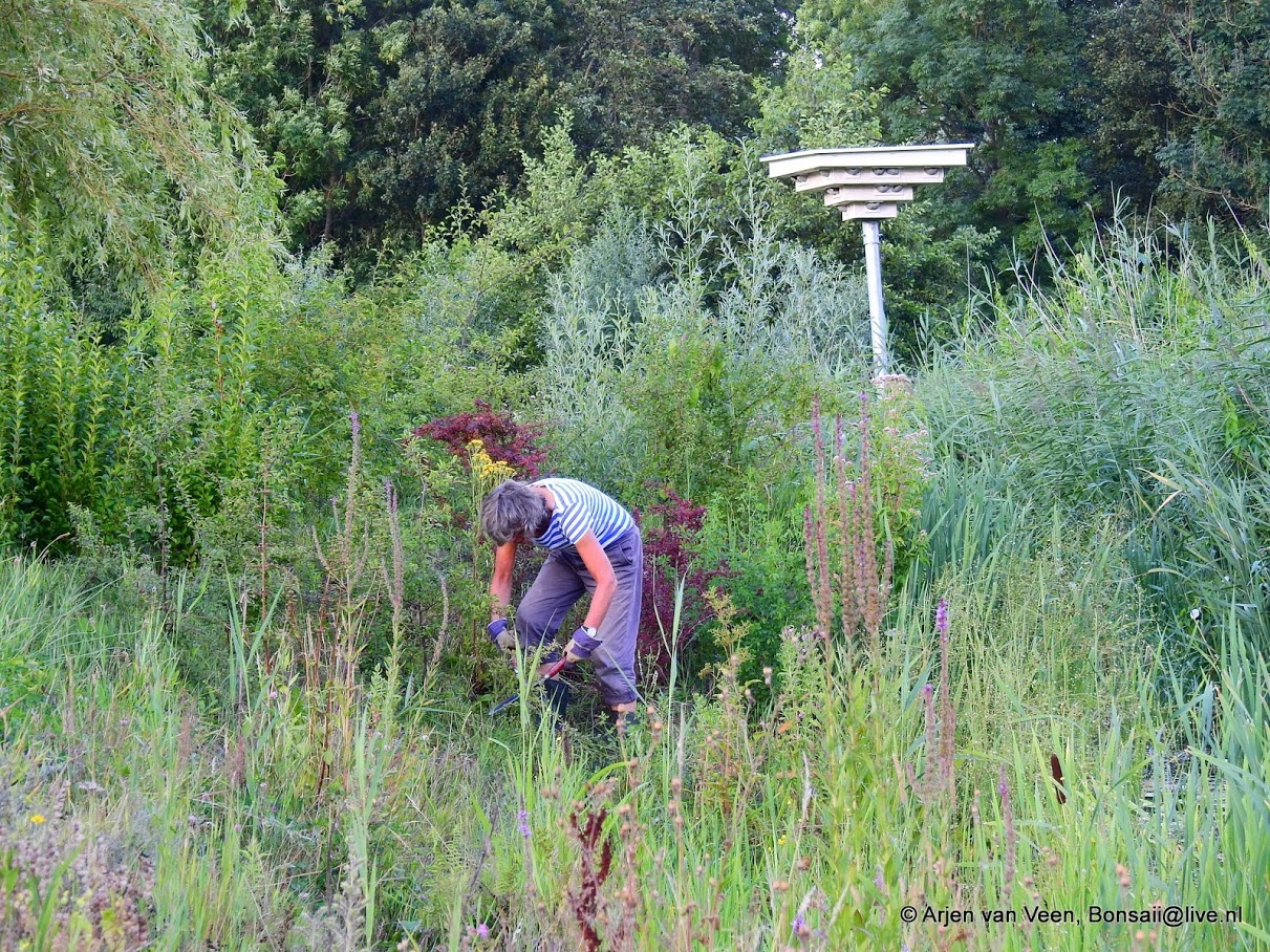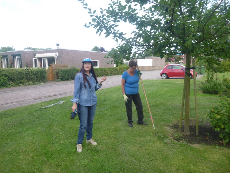 en Winnifred, Diana en Alfred zorgen voor “het uitmaaien achter” en het schonen van de border aan de ene kant van het grote veld en Yvonne en Henk die aan de andere kant. Daar start Henk met het kantje steken. De afvalbrigade Arjen, Ad en ik zorgen dat de inhoud van alle gele zakken op de compostplek komt. Rob zorgt voor lekkere koffie en dito koek. En speciaal voor Elise nemen wij deel aan een onderzoek hoe heet kan de soep worden gegeten.