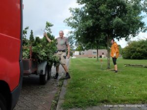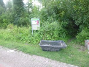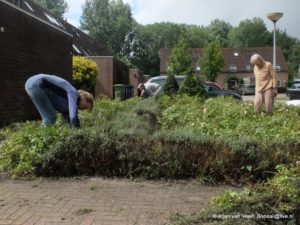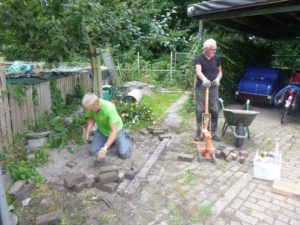 Thom is binnen de kortste keren van top tot teen bezweet. Dat ouderwetse klinkers in kloppen is een pittig klusje. Lap maakt de afvalbakken leeg ronde. Een grote opbrengst deze keer. Stel je voor dat al die meuk niet in de afvalbak gestopt zou zijn. Lap schoffelt en knipt de hagen langs het Hoekwierdepad. Het beheerpaadje tussen de moestuincomplex en het windbos is geheel dicht gegroeid. Met gevaar voor eigen leden, vanwege de oprukkende braam en de brandnetel, maai ik de weg weer vrij.