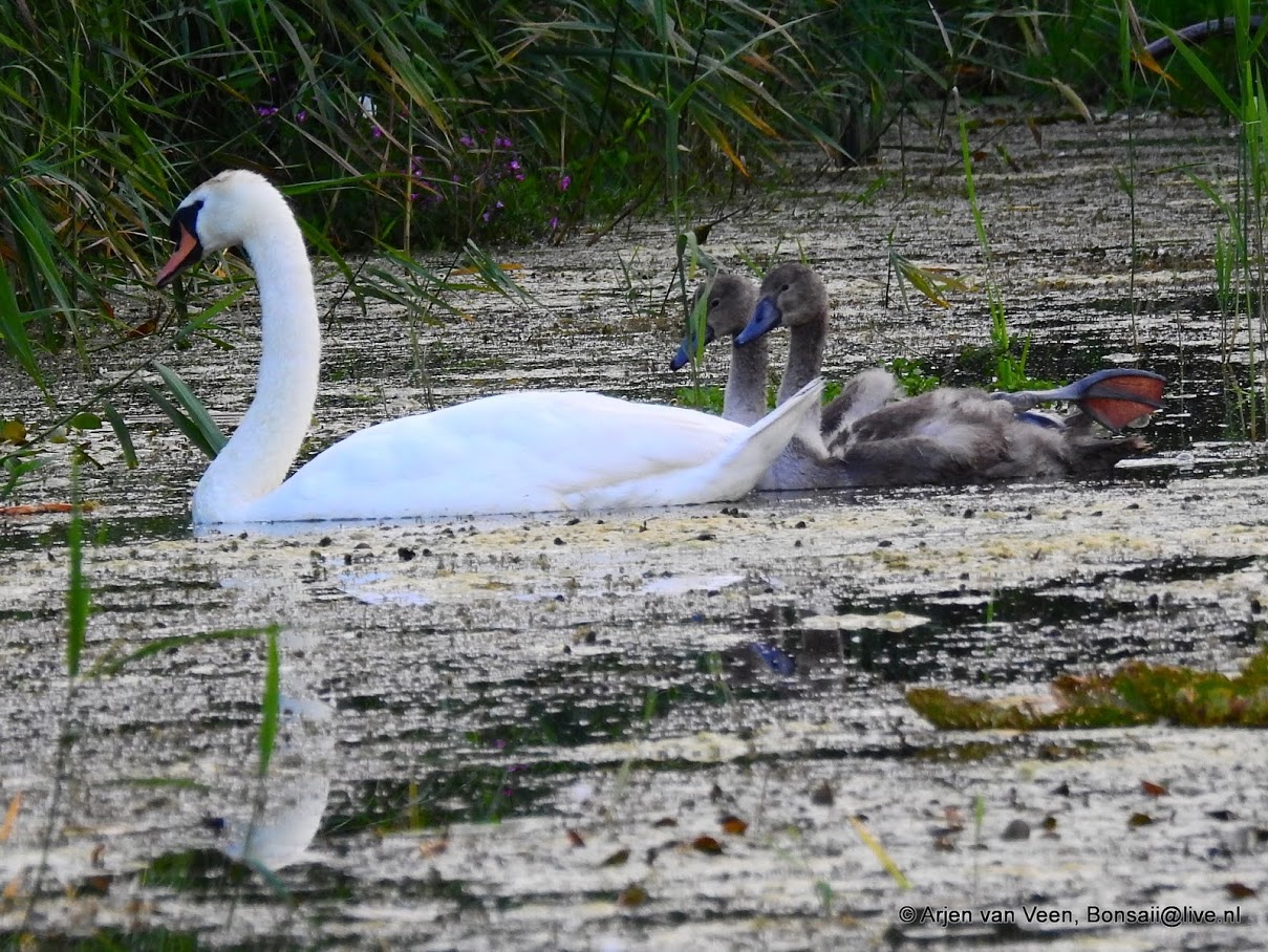 De zwaan en zijn/haar jongen doen zich te goed aan het kroos en andere waterplanten in de kwelbeek. Met de eerder gememoreerde fecaliën tot gevolg.