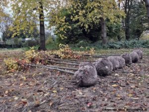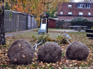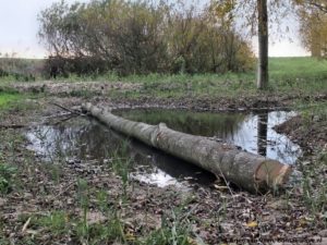 Vandaag begint voor mij de dag vroeg als daar op de stoep Arjen van de gemeente en een boomdeskundige staan. Wij maken een ronde door het windbos over de te vellen zieke essen. Afspraak is dat rond de planning van de zaagploeg de gemeente de essen gaat vellen. De zaagploeg ruimt op. Over de essen langs de gracht is niet gesproken. Daar gaan anderen over. Als cadeautje brengt de trekker van de boomdeskundige een essenstam naar “de plek”. Het eerste speel element.