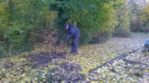 Het is mooi weer. De blaadjes zijn droog. Bij de bosborder volgen de blaadjes gewillig het wegsturen door Arjen en Cees. Op verzoek van de beheerders van de bosstrook achter 40-50 dunt Arjen opschot . Ter meerdere glorie van een fraaie balans tussen groen, licht en ruimte.