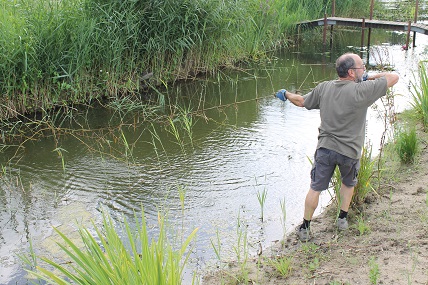 Johan verbreedt weer een stuk van het zandpad vanwege oprukkend riet. En Rob is nog steeds bezig met de grote rietvoornverhuizing. En dat doet hij niet voor niets. Arjen stuit tijdens zijn fotosafari op een ijsvogel in het riet tegenover de wand. De vogel duikt , vangt een vis en vliegt weg voordat de camera van Arjen ingesteld is. Het beestje doet zijn naam eer aan. De blauwe flits. En steekt zijn tong uit naar Arjen. Of is het een visje. Tja, het gaat allemaal zo snel.
