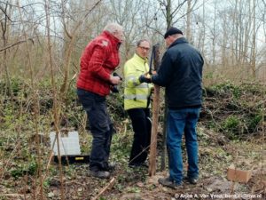 Rob , Ton en ik zijn in de weer met boombanden voor resp de boom bij Rob en de bomen op het grote veld. Met Lars en Bram verzorg ik een zand transport op de plek. Paula loopt rond met een smile van oor tot oor vanwege de voortgang van de crowdfunding voor de plek.