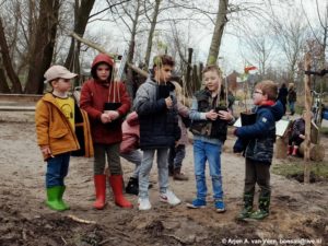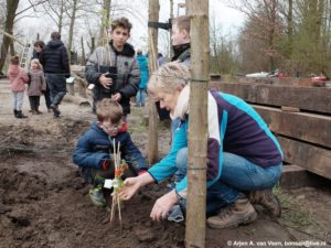 Simon plant rozen en phlox in de triple A, Marrie, Nicolette en Lap planten in het vogelbos linden, lijsterbessen, kardinaalsmutsen en een appel.