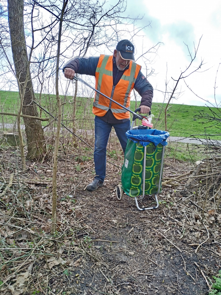 en Lap verzorgt fluitend een afvalbak ronde.