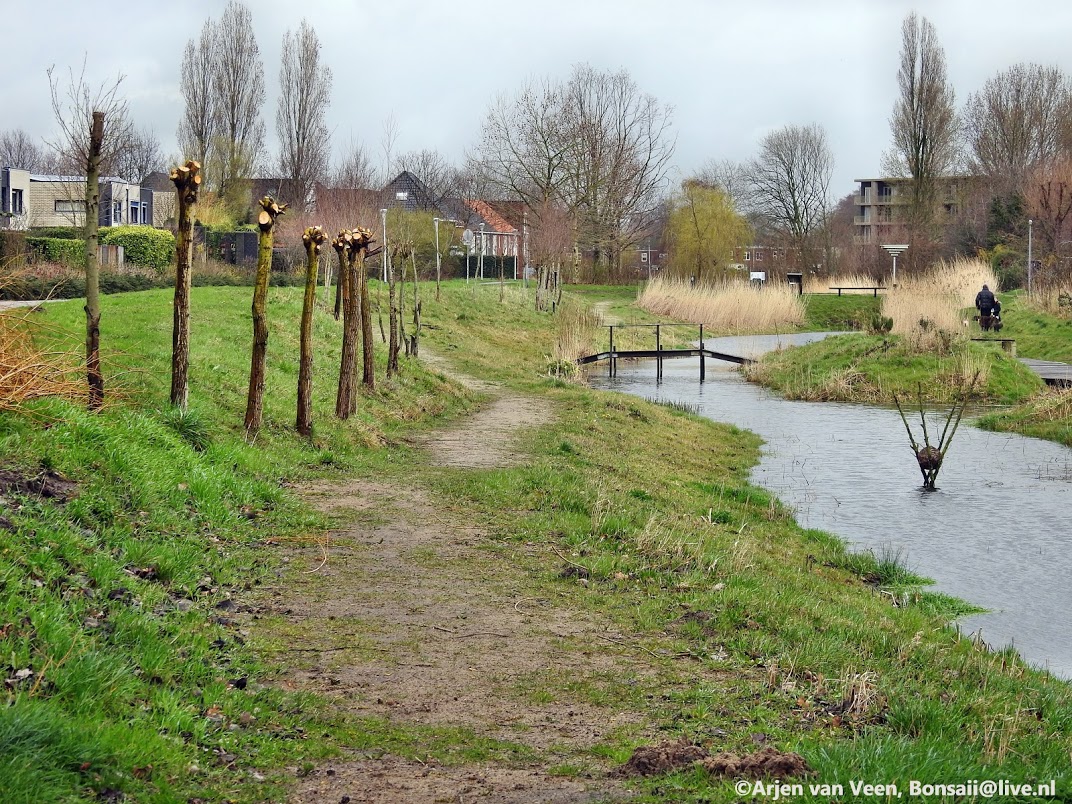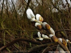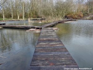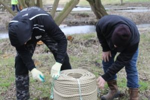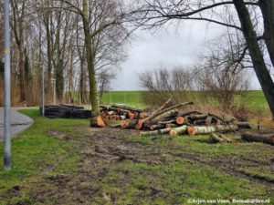 Prachtig bouwmateriaal voor “de plek” tipies. Jos speelt in het krachtbossie. Regien, Johan en ik voeren een vracht richting de plek. Tevens jut het drietal nog enkele fraaie wilgenstaken om mee te kunnen planten en bouwen. Wij rijden over de dijk en zien de schuimkoppen op het water en het water slaat op de oever met zo een kracht dat het fietspad nat wordt door het opspattende water. Johan ziet nieuwe bankjes langs de dijk. “Ik denk niet dat het testcentrum hier een lovend woord over kan dichten”. Raymond en Levien zetten met paaltjes de plekken uit waar zaterdag de stammen spiraal gaat komen.