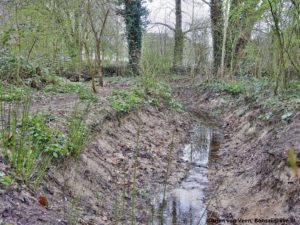 Regien en ik droppen hoopjes zwarte grond. Dat is grond voor bij de te planten bomen en om ondiepten uit te vlakken. Wij rillen nog wat en Regien zegt; “kijk daar een rode bekerzwam”.