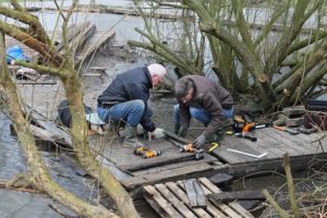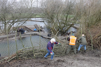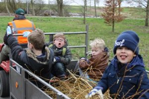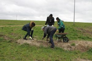 Tijdens de NL doe dag is er hard gewerkt aan de speelplek voor kinderen bij de dijk. Terwijl de storm om ons heen loeide, werd er door jong en oud hard gewerkt. Kinderen met kleine spades en handschoentjes aan hielpen dapper mee. Een ritje met de tractor was echt favoriet. Onderwijl ontstond er een tipi van wilgentenen en werden er overal rillen aangebracht om enigszins voor beschutting te zorgen. Kinderen kunnen hier naar hartenlust klimmen en ‘slootje’ springen, kikkervisjes vangen…..het wordt een mooie plek. Voor onze kinderen ook heel leuk om daar te spelen”.