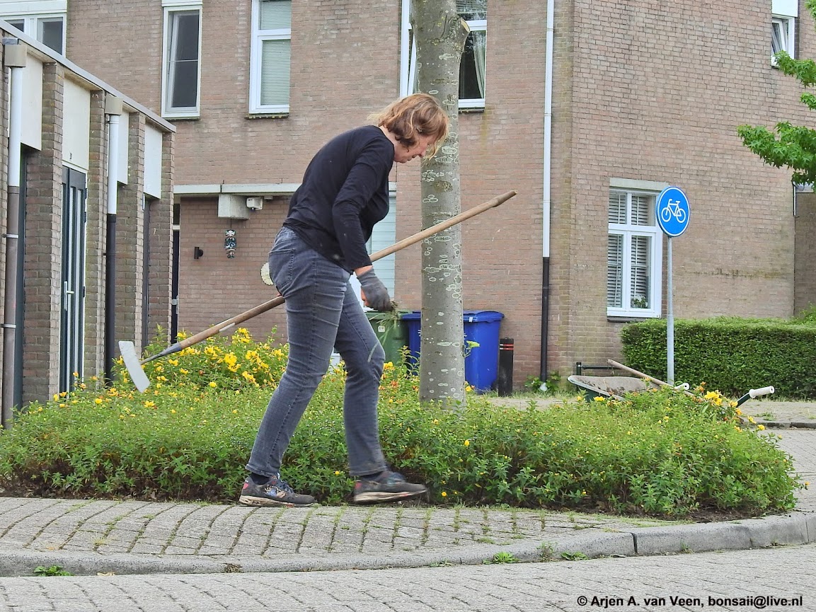 Elly verwijdert ongewenst groen in een nieuwe struikenborder,