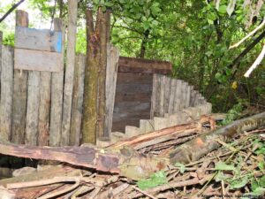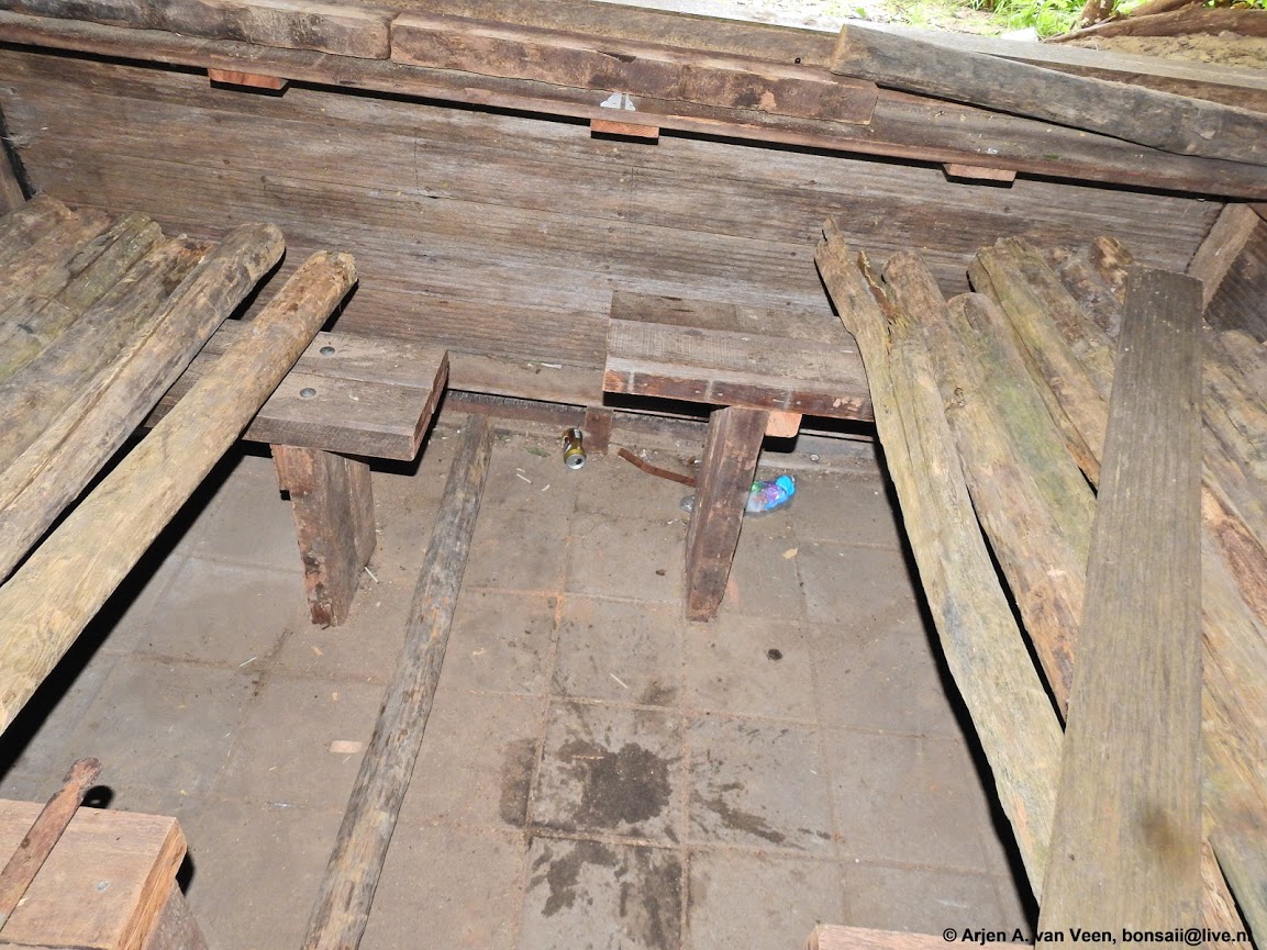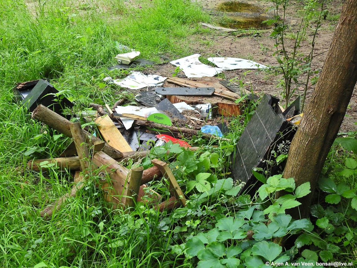 Wat is er loos met die gasten die dit gedaan hebben? . Ze willen en kunnen niet lezen en leren en hebben geen respect voor mijn en dijn. Kennelijk zijn ze tegelijk boos en hersenloos. Het kan stuk dus het moet stuk. De sloop actie moet op maandag of dinsdag zijn gebeurd want maandag lagen er alleen nog bier blikjes . Later raadpleeg ik de facturen, het tuig heeft voor 692.12 aan gort geslagen. Een klap in het gezicht van de bouwers en de vele sponsoren. Enkele etterbakken verpesten het voor zoveel mensen die hier groot plezier beleefden. De vraag is wie iets gezien of gehoord heeft. De vraag is ook gaan wij door met dit soort educatieve voorzieningen. Gaan wij plaatmateriaal vervangen? , camera’s plaatsen? , een deur met slot plaatsen? , een buurtwacht organiseren.? Alle suggesties zijn welkom. Later op de dag hoor ik dat Ad als eerste de chaos in de hut aantrof. Hij kon het niet aanzien en is gelijk begonnen met opruimen. Vandaar dat ik een aangeveegde hut aantrof. Alles wat stuk geslagen is gooit Ad op een hoop.