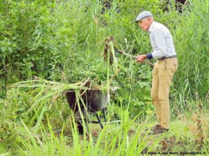 Ine voert een kruiwagen vol met ex hut behang en inventaris af.
