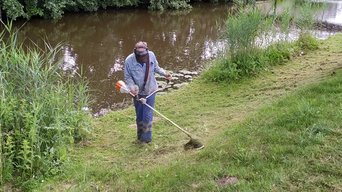 De jarige oudste deelnemer groet de jongste pensionado. Opruimen van hoopjes rond het vogelbos en het opruimen van de rotzooi bij de hut vormen het tijdverdrijf.