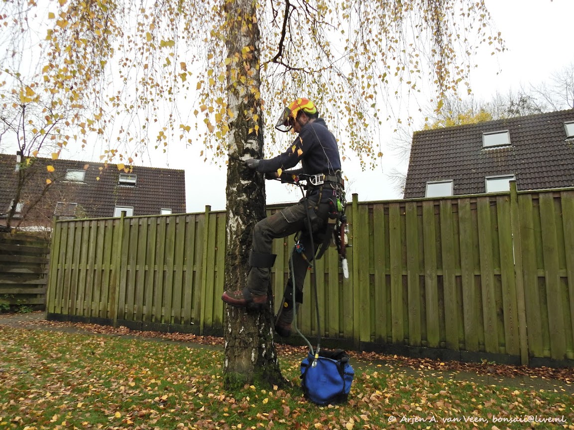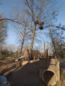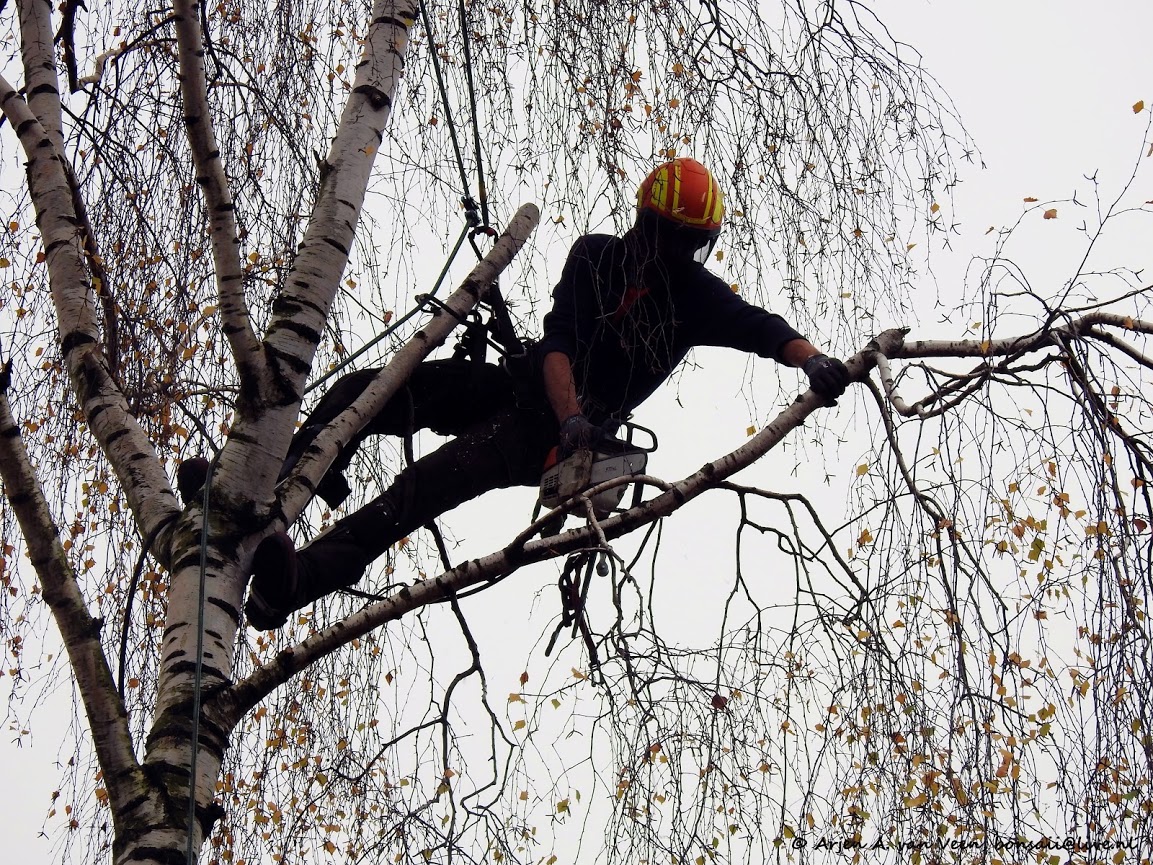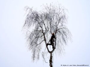 Een berk in de speeldriehoek wordt geveld. Hogere trapeze kunst van Nathan.