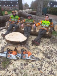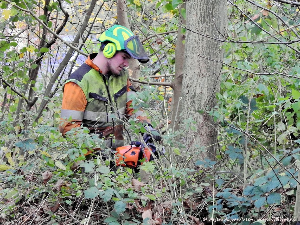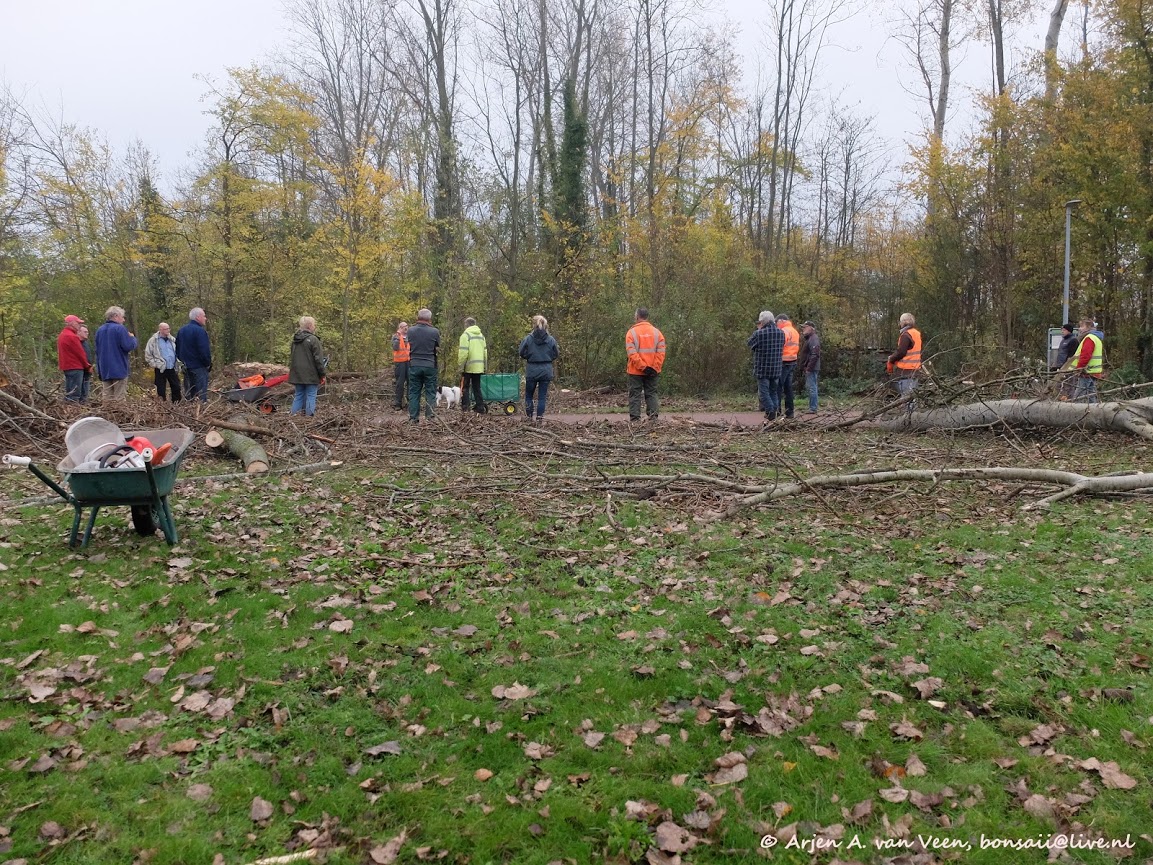 Zagen, geen werk voor vrouwen. Vergeet het maar . Bij ons staan ze in de rij. Regien, Carol, Anita, Winnifred, Nanette, Susan, Greet en Hieke en Elise die helpen bij de catering. Ja, je telt het goed; 9 vrouwen. Die staan hun mannetje , 1.5 meter zij aan zij met Anton, Mike, Thom, Fred, Johan, Martin, Ad, Lex, Chris, Jos, Alfred, Martin, Arjen , Hans en mij. Ja , inderdaad, 15 mannen. Nou ja, mannen? Bij elkaar kom je op 24 deelnemers die zich storten op de puinzooi die de gemeentelijke zagers eergisteren hebben achtergelaten. Bij de aftrap gaat het over drie dingen. Veiligheid, veiligheid en veiligheid.