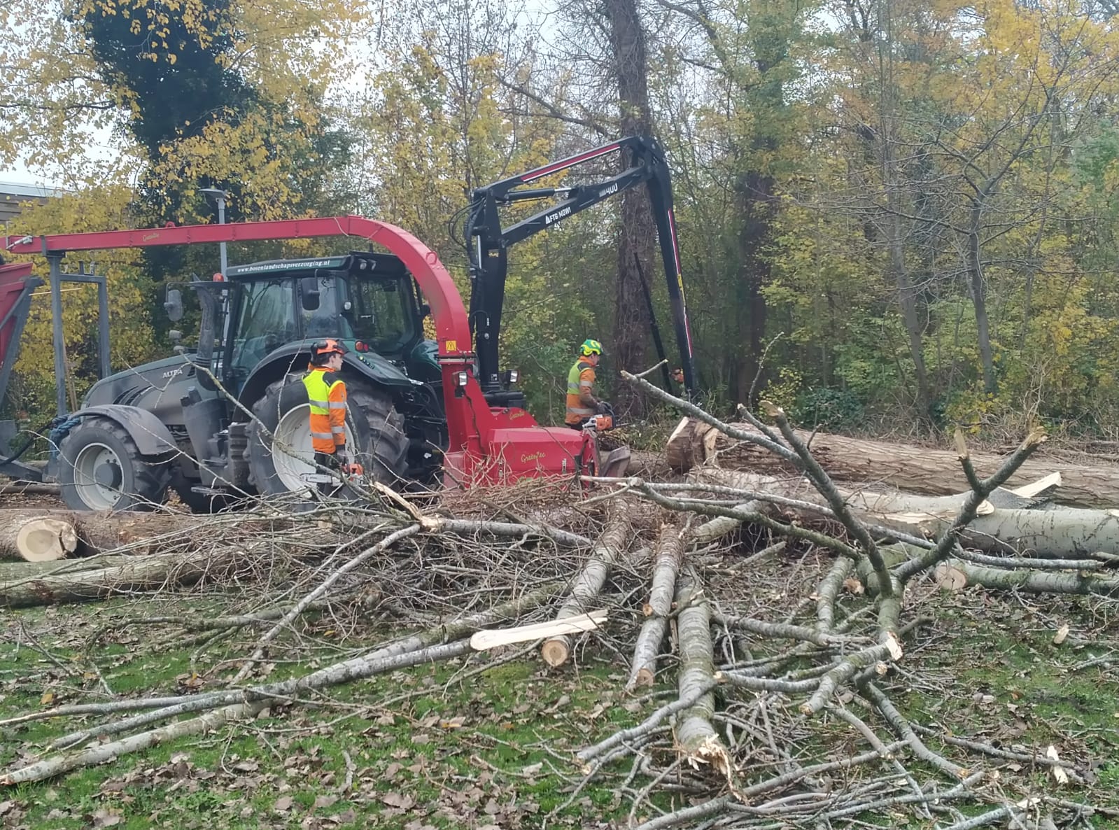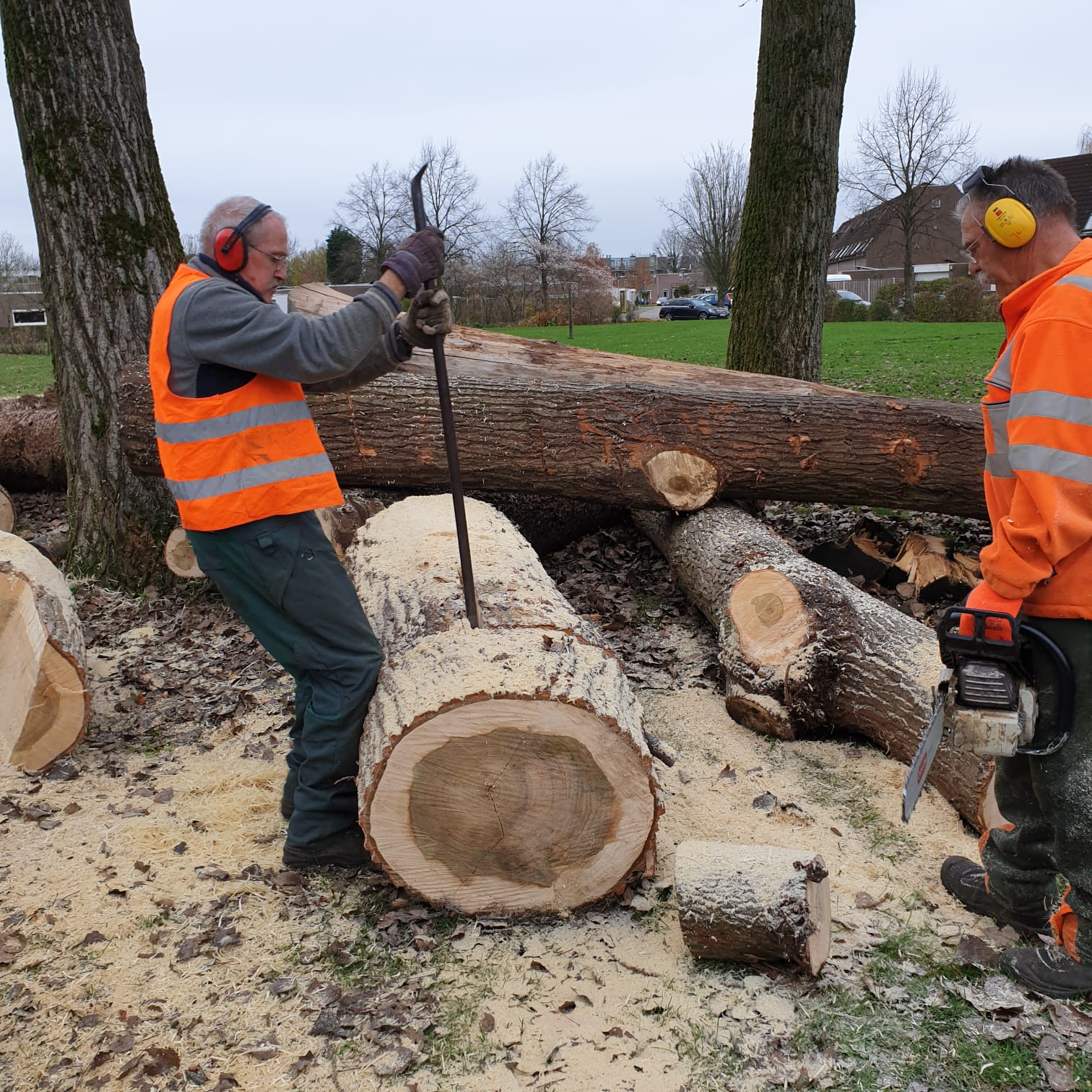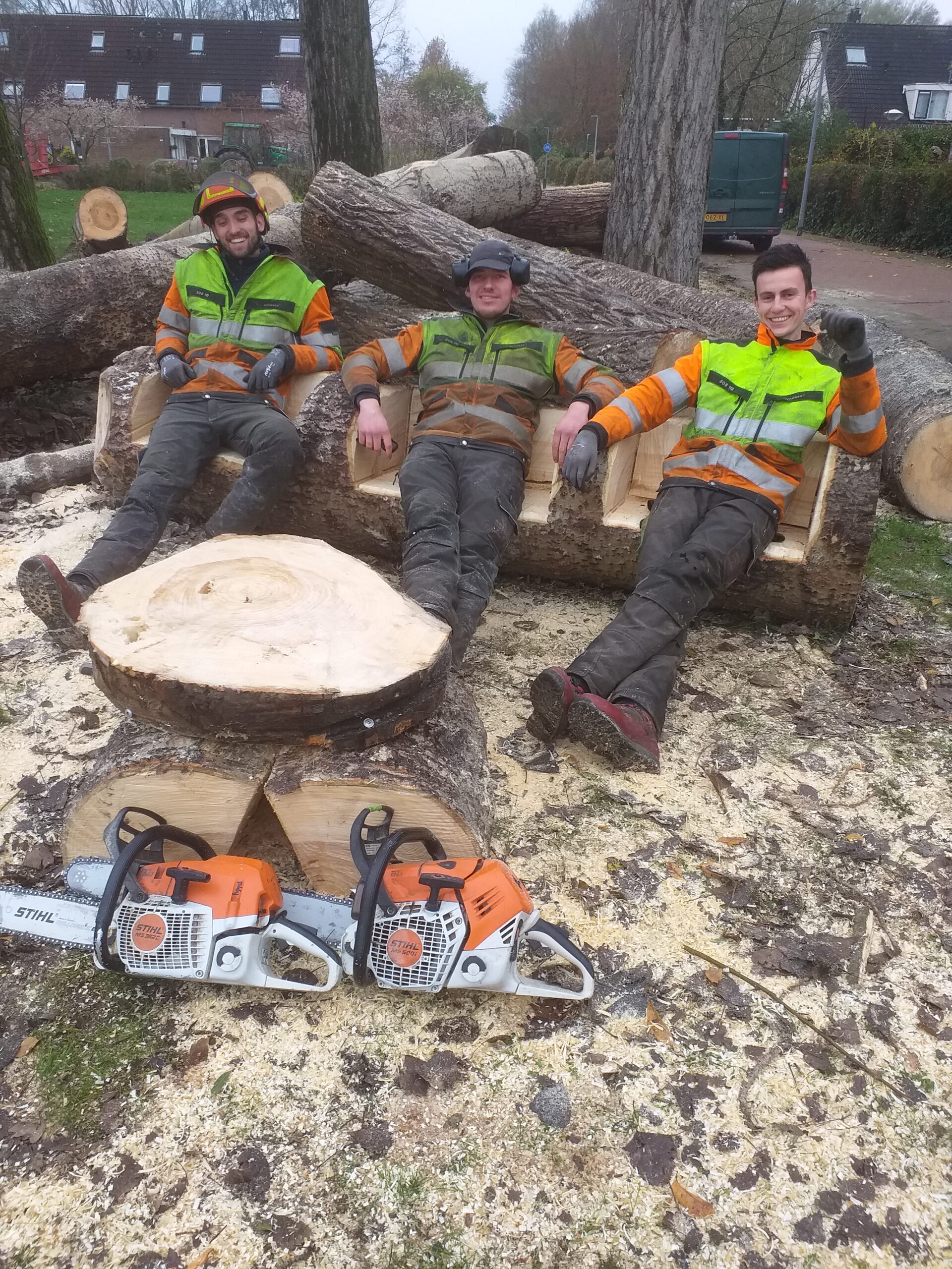 De zon komt op. De zagers van de gemeente rukken met groot materiaal uit. Om half 8 staan daar Tjerk, Nathan en Ivan , de stoere mannen van Piet. Financieel mogelijk gemaakt door de twee Haas. H&H. Henk en Harm van de gemeente. het trio is er een dag eerder dan verwacht. Het kost moeite om Lap uit zijn bedje te lichten.