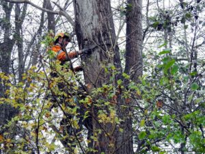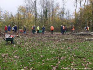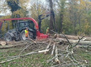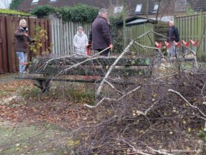 De nieuwe aanplant in het vogelbos krijgt nu meer kans om zich goed te ontwikkelen. Vier bomen, wat een chaos! Zo ziet het er naar afloop uit. Mooie opgave voor de zaagploeg donderdag as.