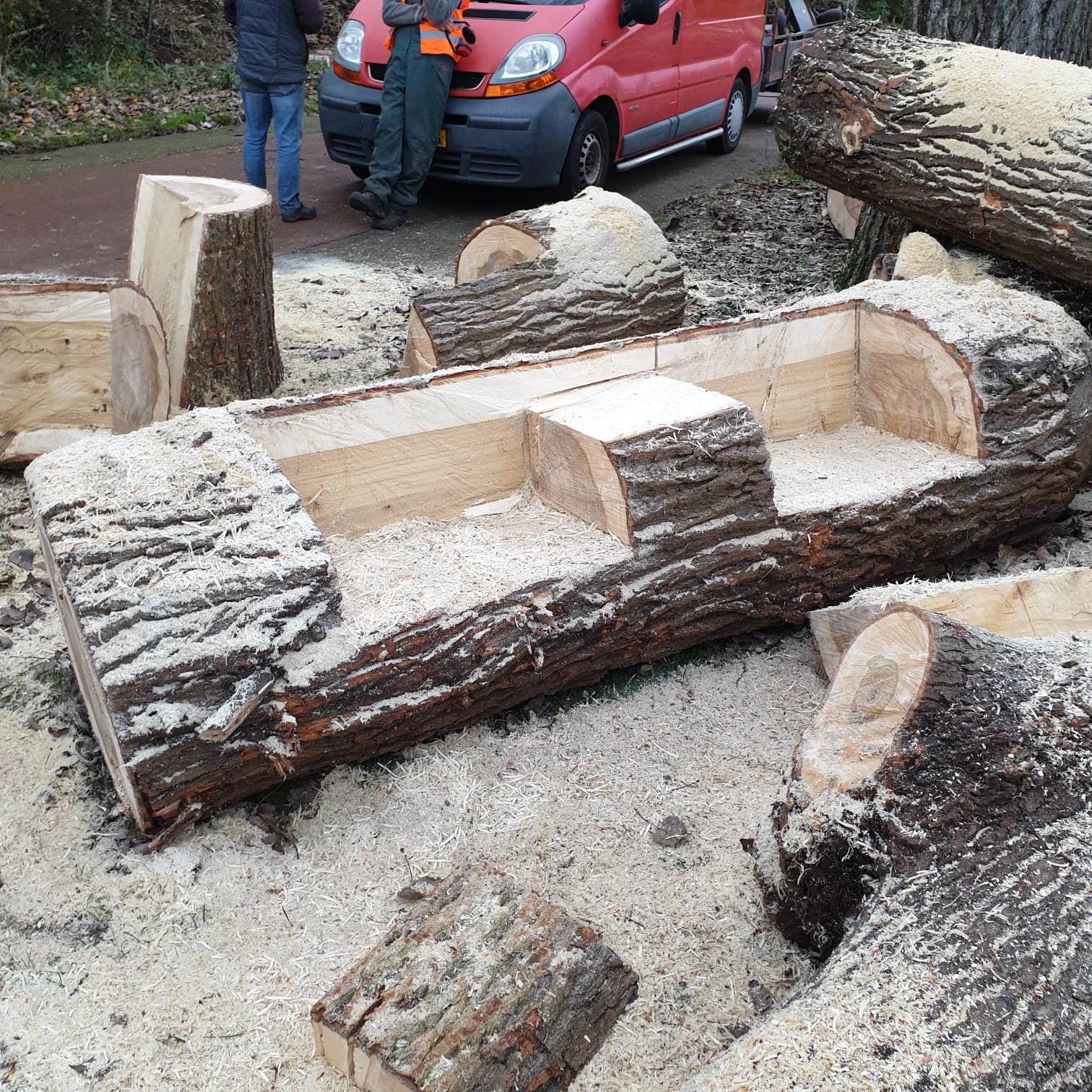 De bankjes voor CC en het krachtbosje komen ook op de plek van bestemming. Velen zijn zo enthousiast over de CC bank dat de boys uit een stam in de speelklimhoek nog een bank toveren. Onze drie musketiers maken gelijk gebruik van de eigen kunst uiting.