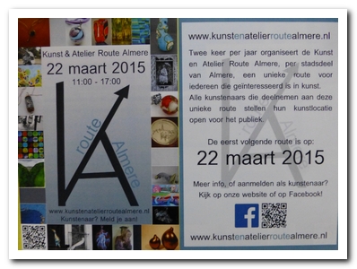 Op 22 maart 2015 tussen 11.00 – 17.00 uur stellen ruim 40 Almeerse kunstenaars hun ateliers open voor het publiek. De deelnemende kunstenaars en de route zijn te bekijken op www.kunstenatelierroutealmere.nl . Ook ik doe mee, graag zie ik jullie langskomen!