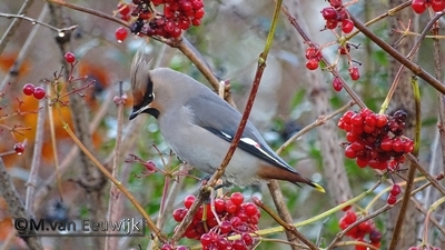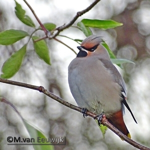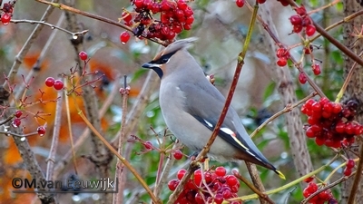 Wij hebben één pestvogel in de Hoekwierde. Niet eerder hebben wij zo’n beestje kunnen noteren op onze soortenlijst. Nu wel! Paul en Hans zagen hem gisteren, Greet op haar vogelrondje vanmorgen, Marion nadat ze door Greet er op attent werd gemaakt.  Daar liet ik dus geen gras over groeien en heb foto’s gemaakt. Eenmaal op waarneming gezet volgde er meerdere belangstellenden. Het is een in de winter vaak weinig voorkomende vogel. Er zijn jaren dat er geen waarnemingen zijn en sommige jaren worden ze veel gezien in kleine groepjes of zelfs hele invasies.