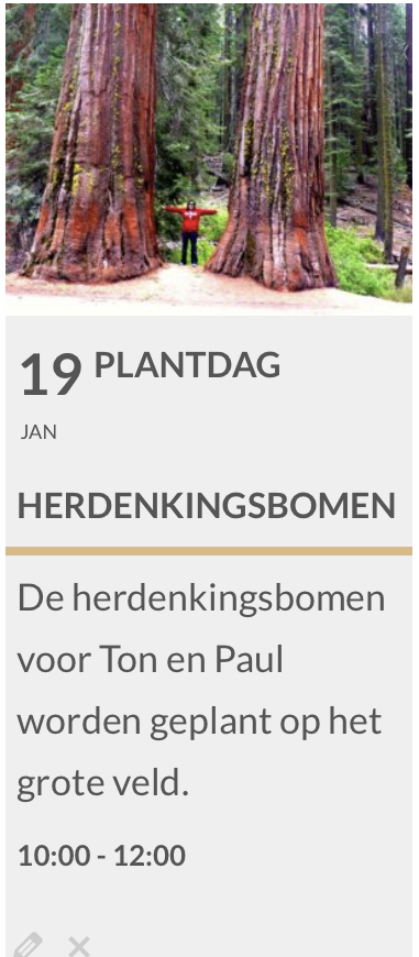 Ine deelt mee, dat door de aannemer a.s. woensdag 19 januari tussen 10:00 en 12:00 uur de twee Mammoetbomen worden geplant op het grote veld ter ere van Paul en Ton. Ieder is uiteraard welkom om het plaatsen van de bomen te bekijken.